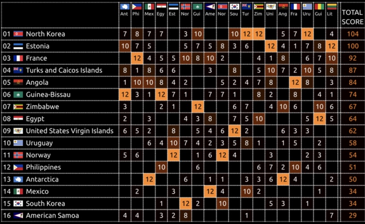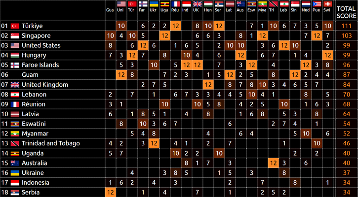 26 countries competer in the grand final. Serbia failed to vote in a timely manner, due to the fact that their delegate left the server once their non-qualification was announced. Türkiye claimed their second victory in the competition with a whopping 212 points, breaking the previous record originally set by Canada in Season 16. This was followed by Switzerland, placing 2nd once more with 154 points. Closing off the top 3, North Korea places 3rd in the podium with a total of 141 points. Guinea ended up last in the final with a total of 29 points.